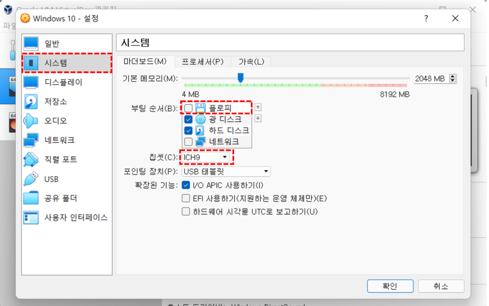 설정에서 시스템 탭 확인, 플로피 체크 해제 및 칩셋 변경