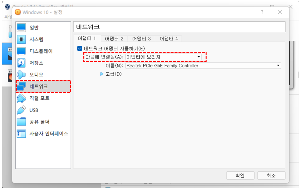 # 어댑터에 브릿지 설정은 Host PC와 동등한 수준의 네트워크 구성으로 가상 머신에도 추가 IP 할당이 필요하다.