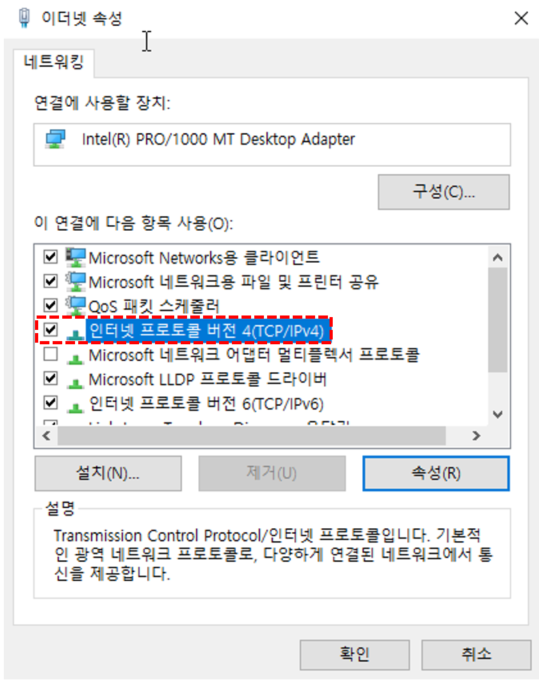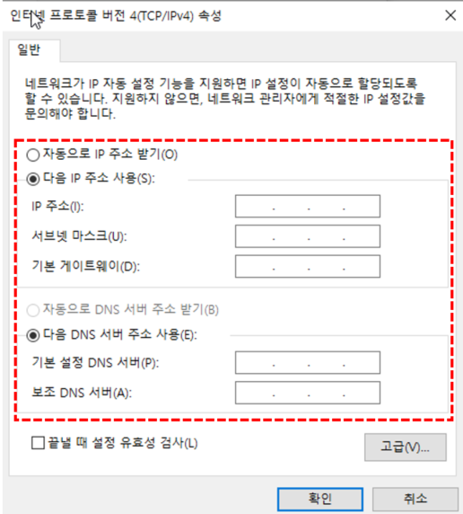 인터넷 프로토콜 버전4(TCP/IPv4) 설정