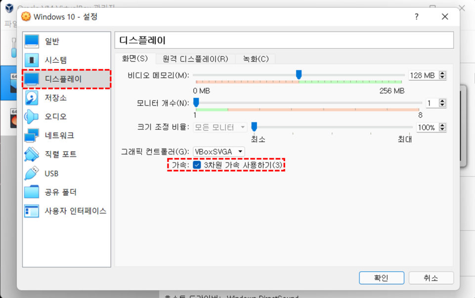 디스플레이 탭 이동, 3차원 가속 설정