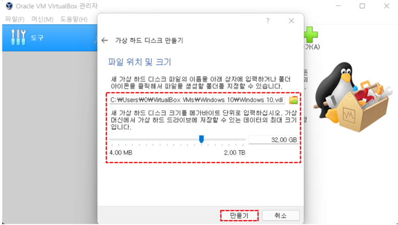 하드 디스크 파일 위치 및 크기 설정