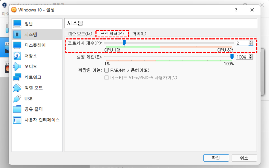 시스템 탭에서 프로세서 이동, CPU 개수 선택
