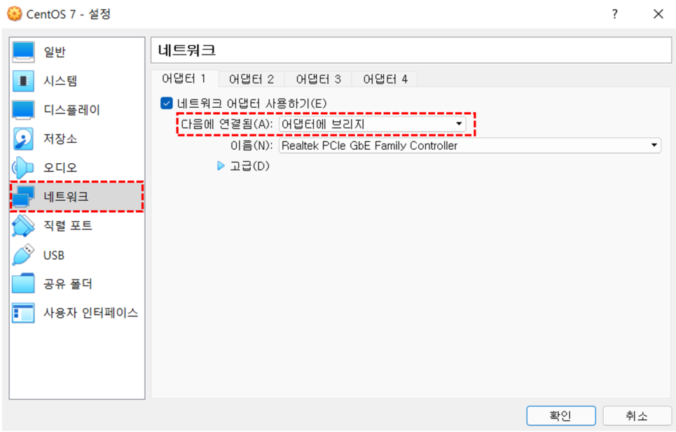 네트워크 설정에서 어댑터에 브리지 변경 후, 확인